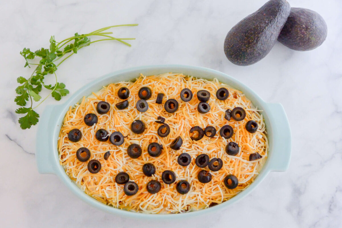 • In a serving dish, layer the ingredients starting with the guacamole, salsa, ground turkey, Greek yogurt, mashed pinto beans, lime juice, sliced olives, and ending with the shredded cheese. Cover and refrigerate until ready to serve.